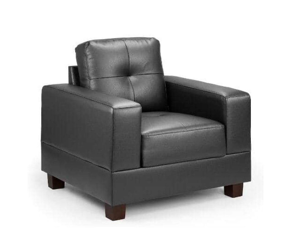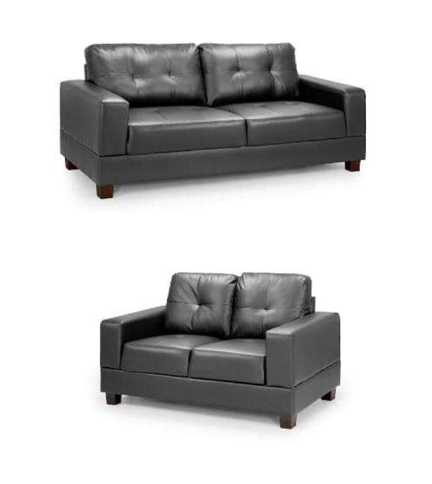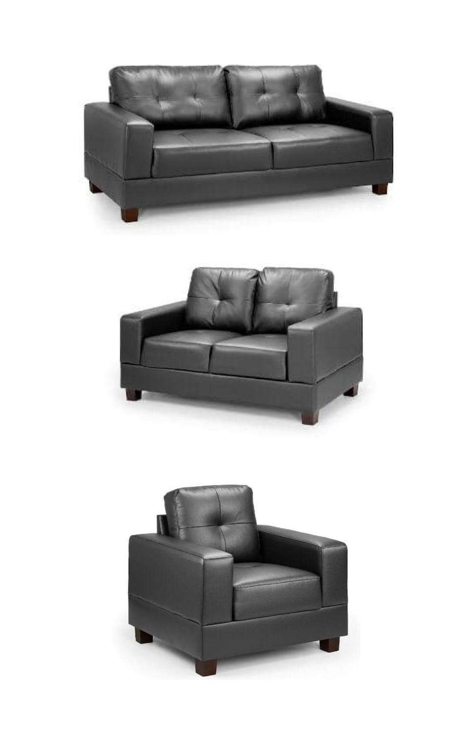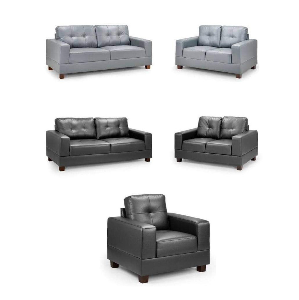 Finished in Soft Eco Leather. A modern and comfortable seating. With foam-filled set cushions and tufted back cushions. Completed with dark wood feet.